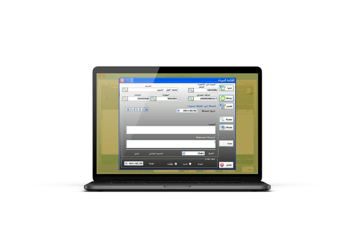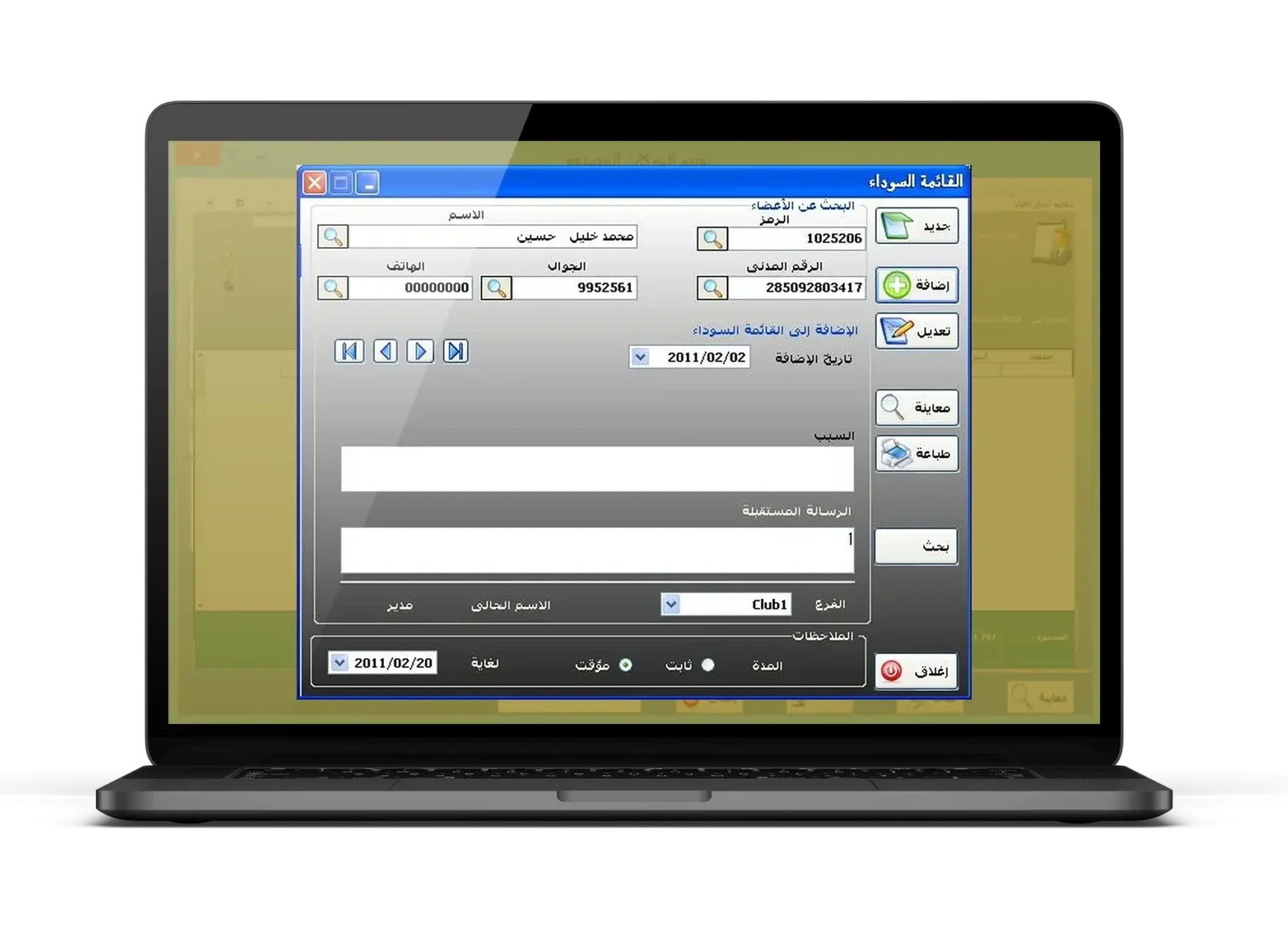Attendance and departure for subscribers are recorded through the fingerprint device. All valid services of the subscriber are displayed and the gate is opened. It is also possible to know the scheduled time for taking the subscriber’s measurements, the date of the last attendance, whether the subscriber has previously been blacklisted or is not allowed to enter this branch, and to view the notes recorded for the subscriber through the alerts panel.